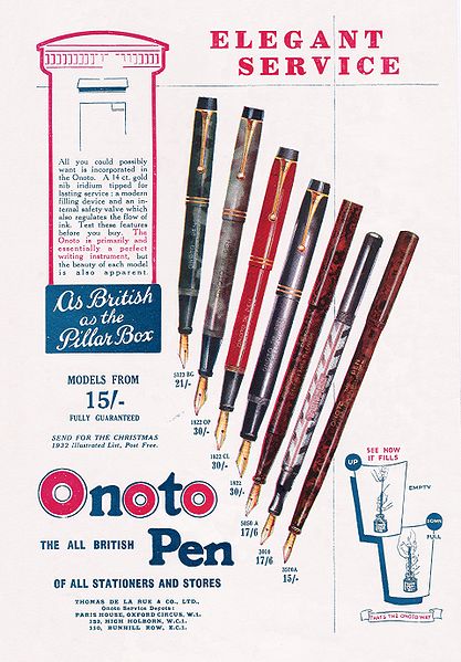 @it|Scansione di una pubblicità Onoto del dicembre 1932. Pubblicata su The Strand Magazine. Ritoccata dall'autore per una maggiore nitidezza. Anno riportato direttamente, riferimento al numero di Natale del sul retro. @en|Scanning of a December 1932 Onoto advertising. Published on The strand magazine. Retouched by the author for a better sharpness. Years directly reported, refers to Christmas number on the back. </multilang>