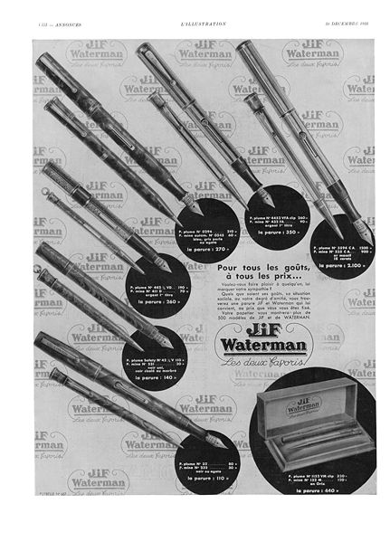 @it|Scansione di una pubblicità Waterman del 30 dicembre 1933 per i suoi modelli. Pubblicata su L'Illustration. Ritoccata dall'autore per una maggiore nitidezza. @en|Scanning of a December 30, 1933 Waterman french advertising for its models. Published on L'Illustration. Retouched by the author for a better sharpness. </multilang>