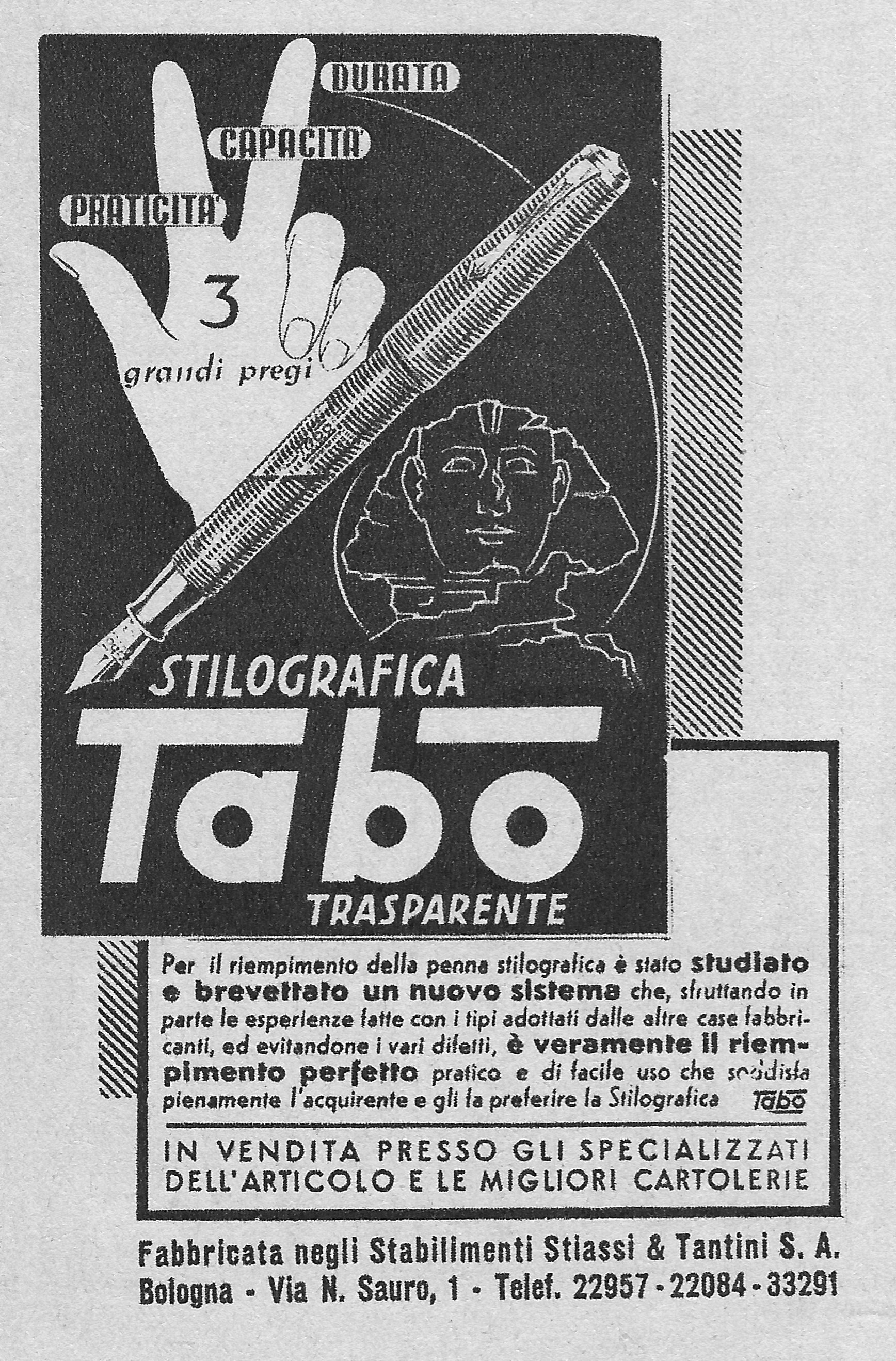 @it|Scansione di una pubblicità della Tabo del 1943, tratta della rivista del Touring Club Italiano Le vie d'Italia. Ritoccata dall'autore per una maggiore nitidezza. Datazione da un articolo della stessa pagina che parla di scontrini per concessioni di viaggio riabilitati se portano la dicitura "solo per il 1943". @en|Scanning of a 1943 Tabo advertising pubblished on the Touring Club Italiano magazine: Le vie d'Italia. Retouched by the author for a better sharpness. Dating from an article in the same page talking about some war restriction on travel tickets raised if the have the imprint "solo per il 1943". </multilang>