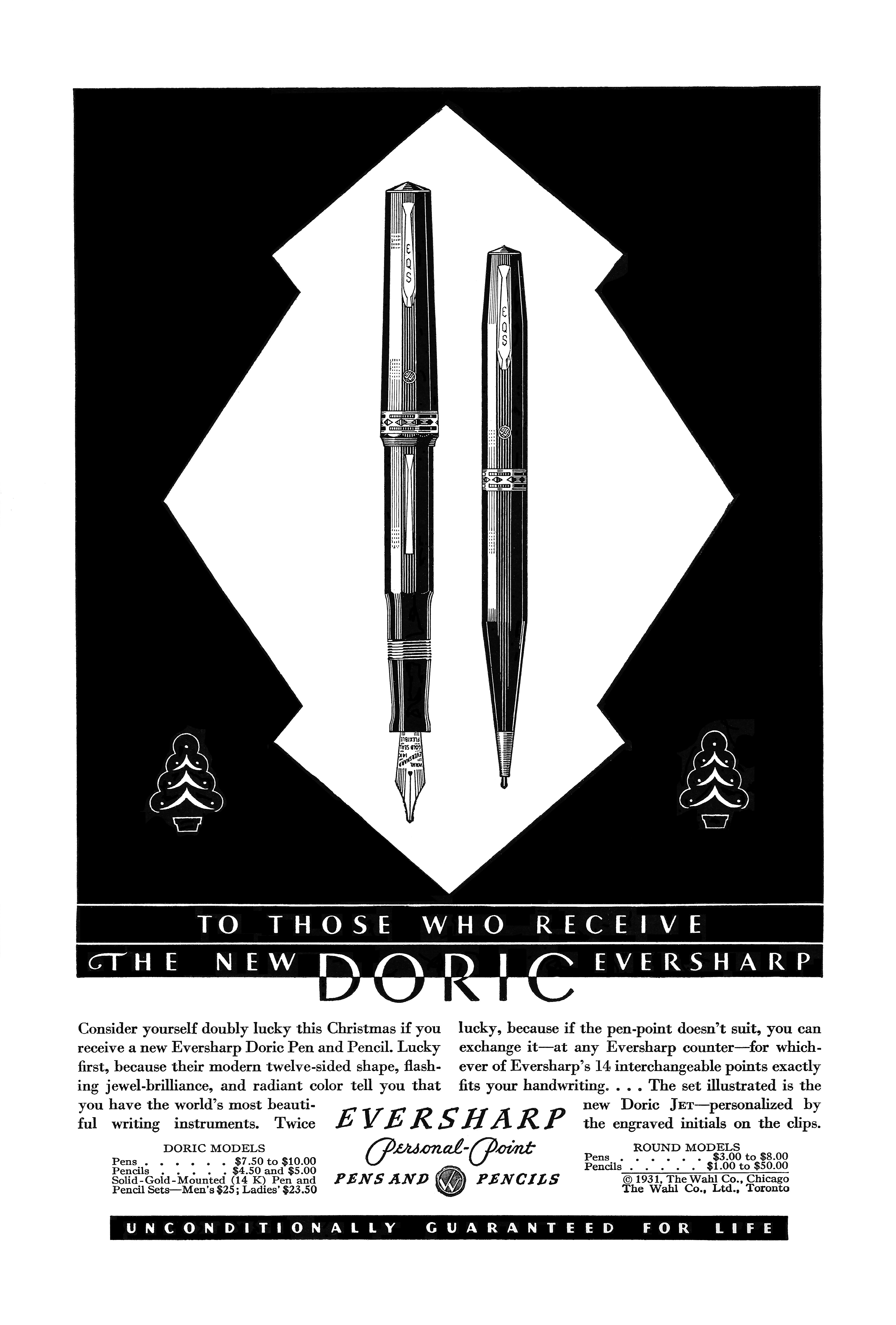 Scansione di una pubblicità del 1931 per il lancio della nuova linea di penne Doric.