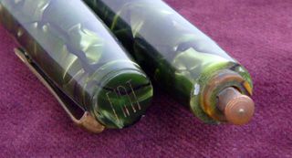 Foto di una Aurora modello Superna in celluloide verde, versione semplificata con caricamento a pulsante di fondo prodotta per la FIAT. Detail of inscription. Template:PhotoBy