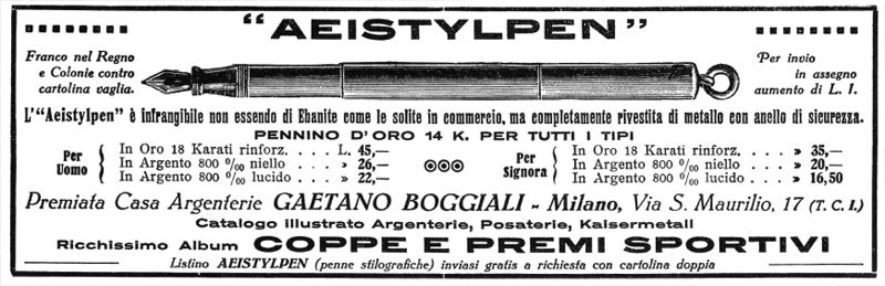 |Note_it=Scansione di una pubblicità del 1925 per penne rivestite marcate Aeistylpen. Ritoccata dall'autore per una maggiore nitidezza. Datazione fornita dal venditore. Sul retro altra pubblicità. @en|Scanning of a 1925 advertisement for some overlay pens branded Aeistylpen. Pubblished on the Rivista del Touring Club Italiano - Le vie d'Italia. Retouched by the author for a better sharpness. Dating provided by seller. On the back other advertisement. </multilang>