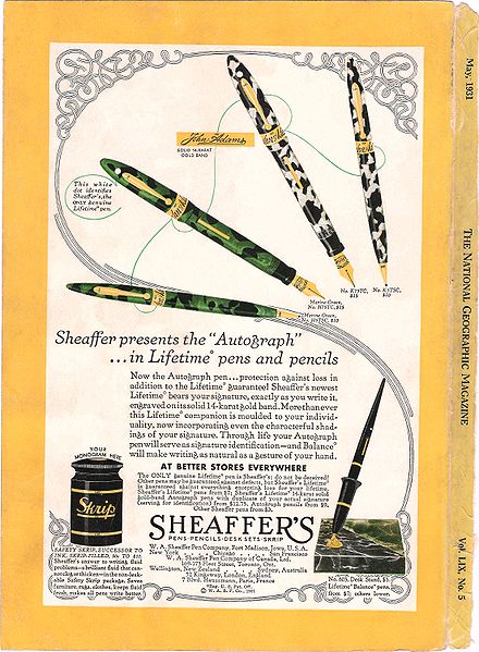 |Note_it=Scansione di una pubblicità Sheaffer del maggio 1931 per il modello Balance, versione Autograph. Pubblicata sul The National Geographic Magazine, Vol. LIX No. 5. Ritoccata dall'autore per una maggiore nitidezza. |Note_en=Scanning of a May 1931 Sheaffer advertising for the Balance model, Autograph version. Published on The National Geographic Magazine, Vol. LIX, No. 5. Retouched by the author for a better sharpness. </multilang>