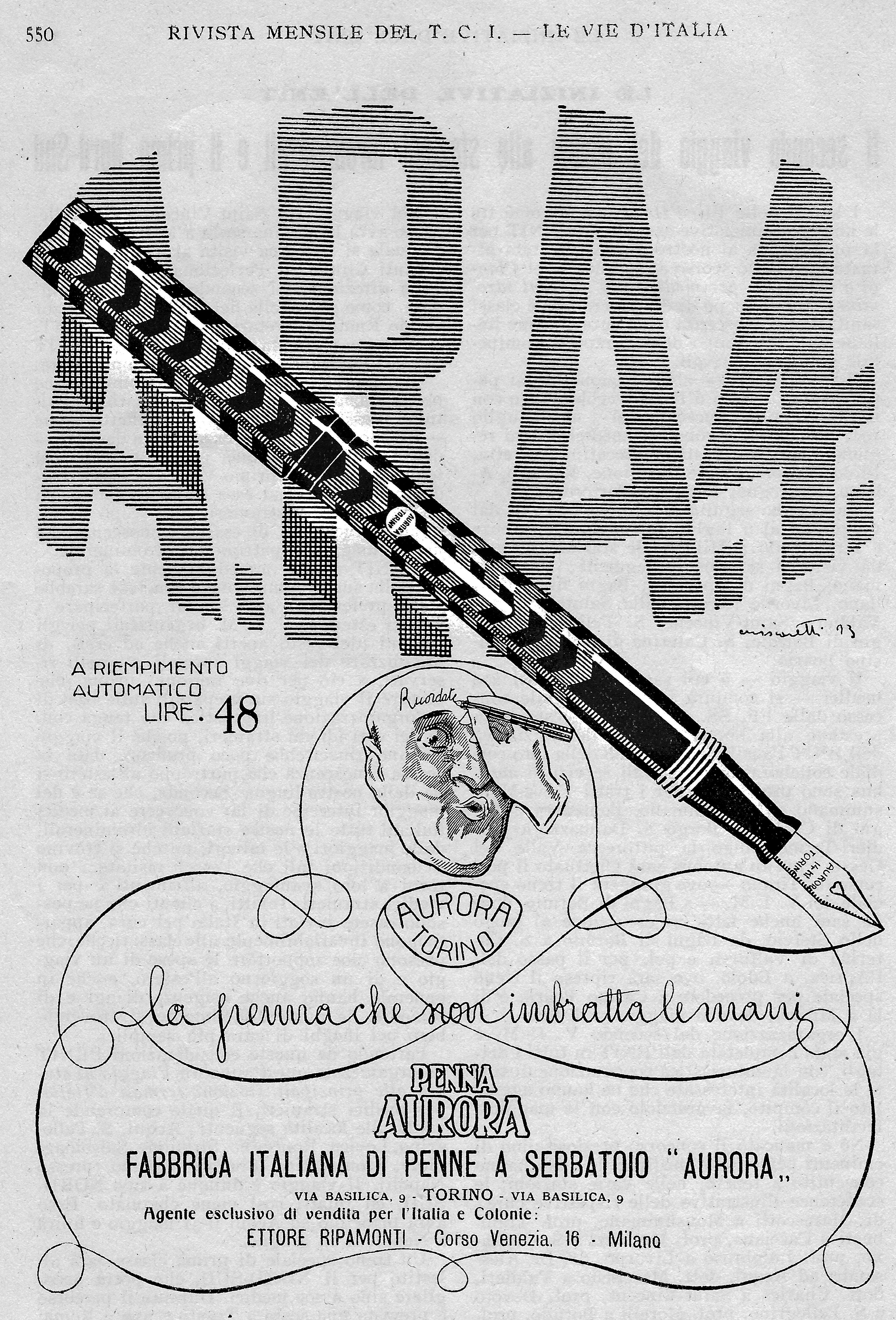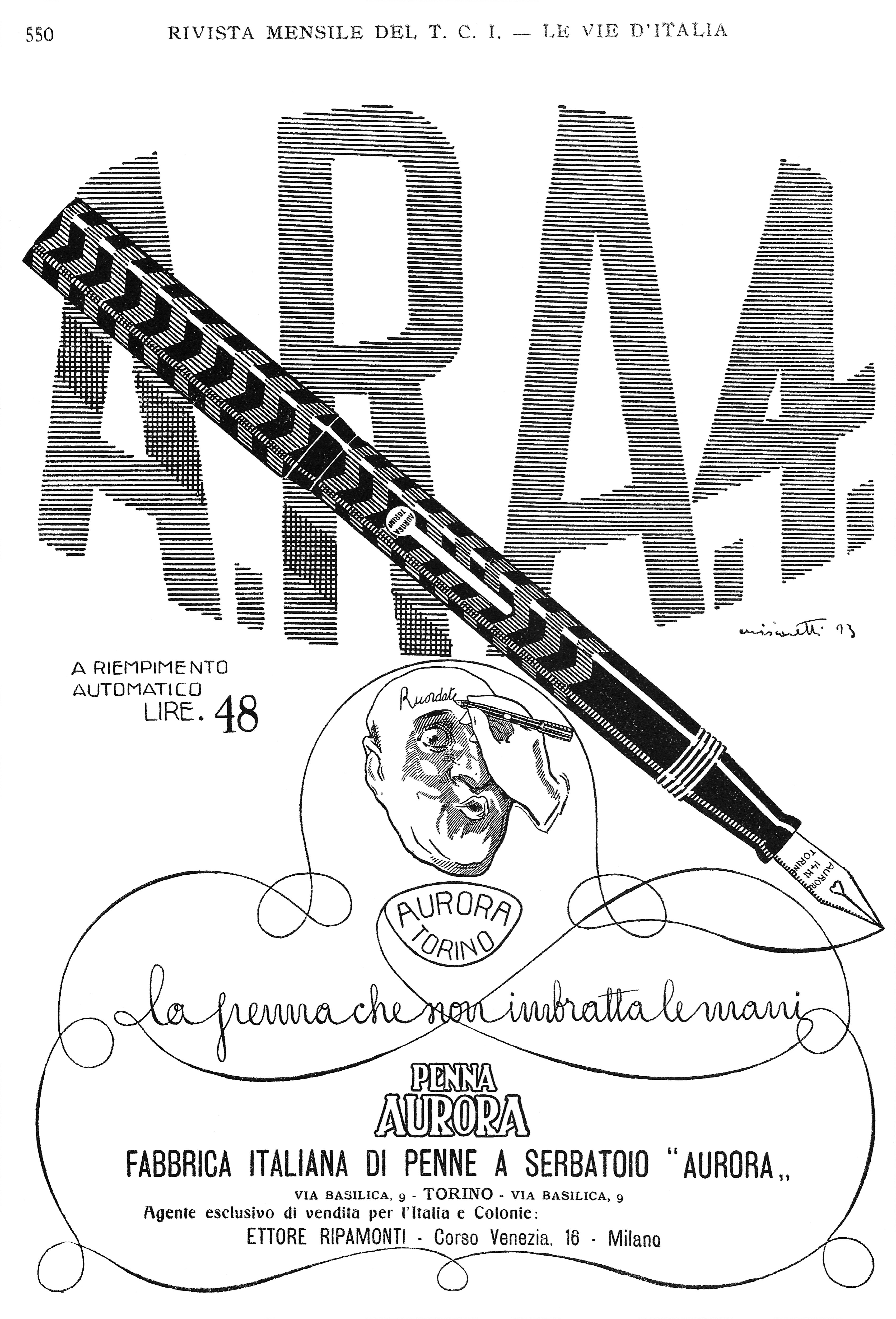 Scansione di una pubblicità della Aurora degli anni '20, tratta della rivista del Touring Club Italiano