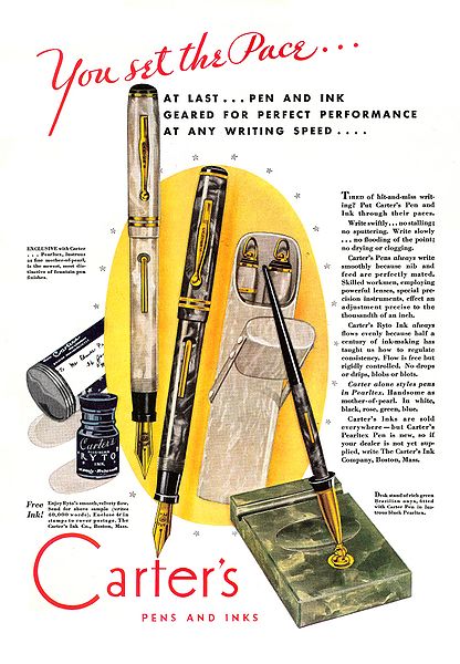 Scansione di una pubblicità Carter datata 1930. Pubblicazione su: The Saturday Evening Post. Data visibile direttamente. Data indicativa, dal modello e da ricerche su google books con risultati solo per questo anno. Ritoccata dall'autore per una migliore nitidezza. Pubblicizza le Carter Pearltex Pen, in Pearltex nella nuova versione streamlined.