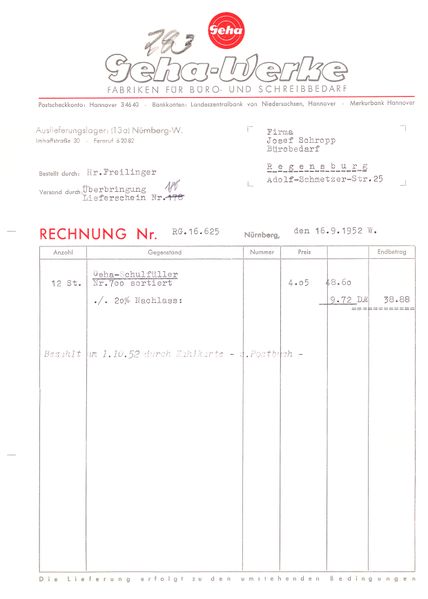 Scanning of an invoice from Geha dated 16 settembre 1952. Date directly visible. Back of the sheet. On the other side of File:Geha-Invoice-1952-09-Back.jpg. Retouched by the author for a better sharpness.