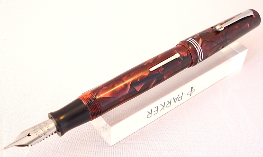 Photo of an Omas Extra in marbled red celluloid with Permanio nib. Late version, made after 1936 when the three rings decoration was introduced.