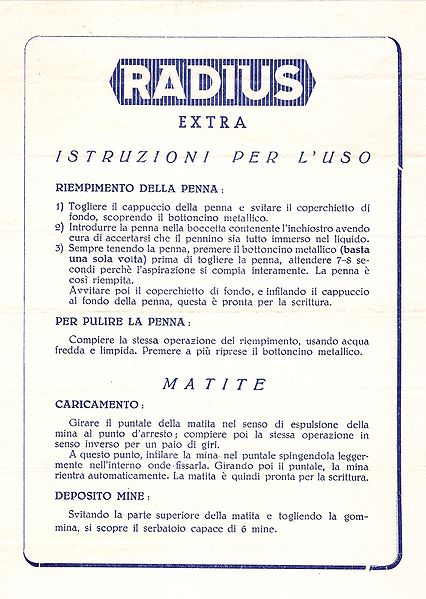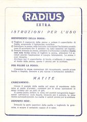 Scansione di un foglietto di istruzioni Radius (sottomarca Società Anonima Fabbrica Italiana Stilografiche) degli anni '40. Relativo ad un modello Radius Extra. Da una confezione originale Ritoccata dall'autore per una migliore nitidezza.