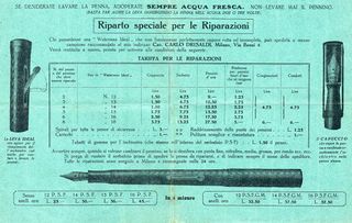 Scanning of a Waterman instruction sheet from '10s. For a Waterman 1x model. Back. Reports repair prices. Dating unsure but certainly after 1914, when Cav. Drisaldi became the Waterman agent in Italy. Courtesy of anonymous. On the other side of File:Waterman-InstrSheet-p01.jpg. Retouched by the author for a better sharpness.