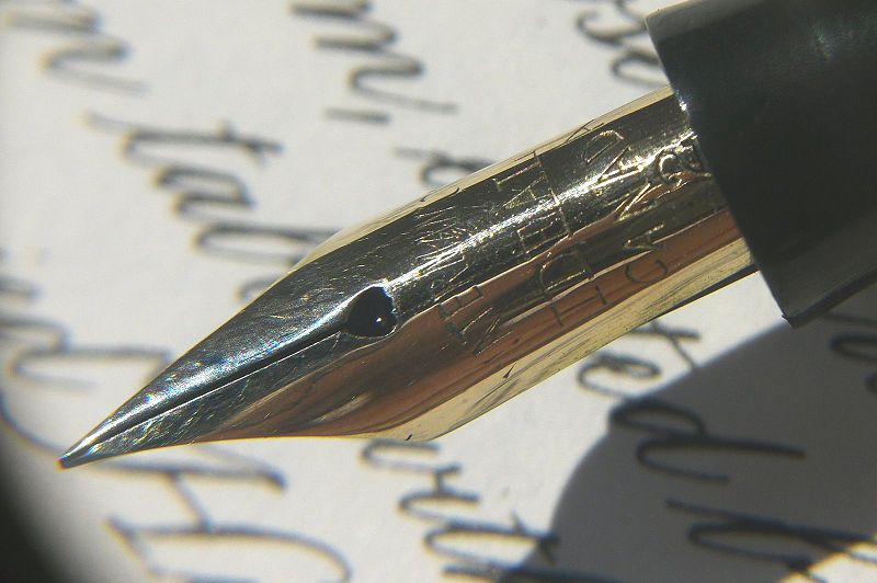 Photo of a Waterman, 52 model in blach chased hard rubber. Detail of nib.