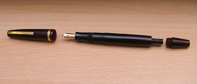 Foto di una Tabo modello S in celluloide anellata rossa. Contributo di Massimo (utente forum.fountainpen.it maxpop 55). Pubblicato col permesso dell'autore.