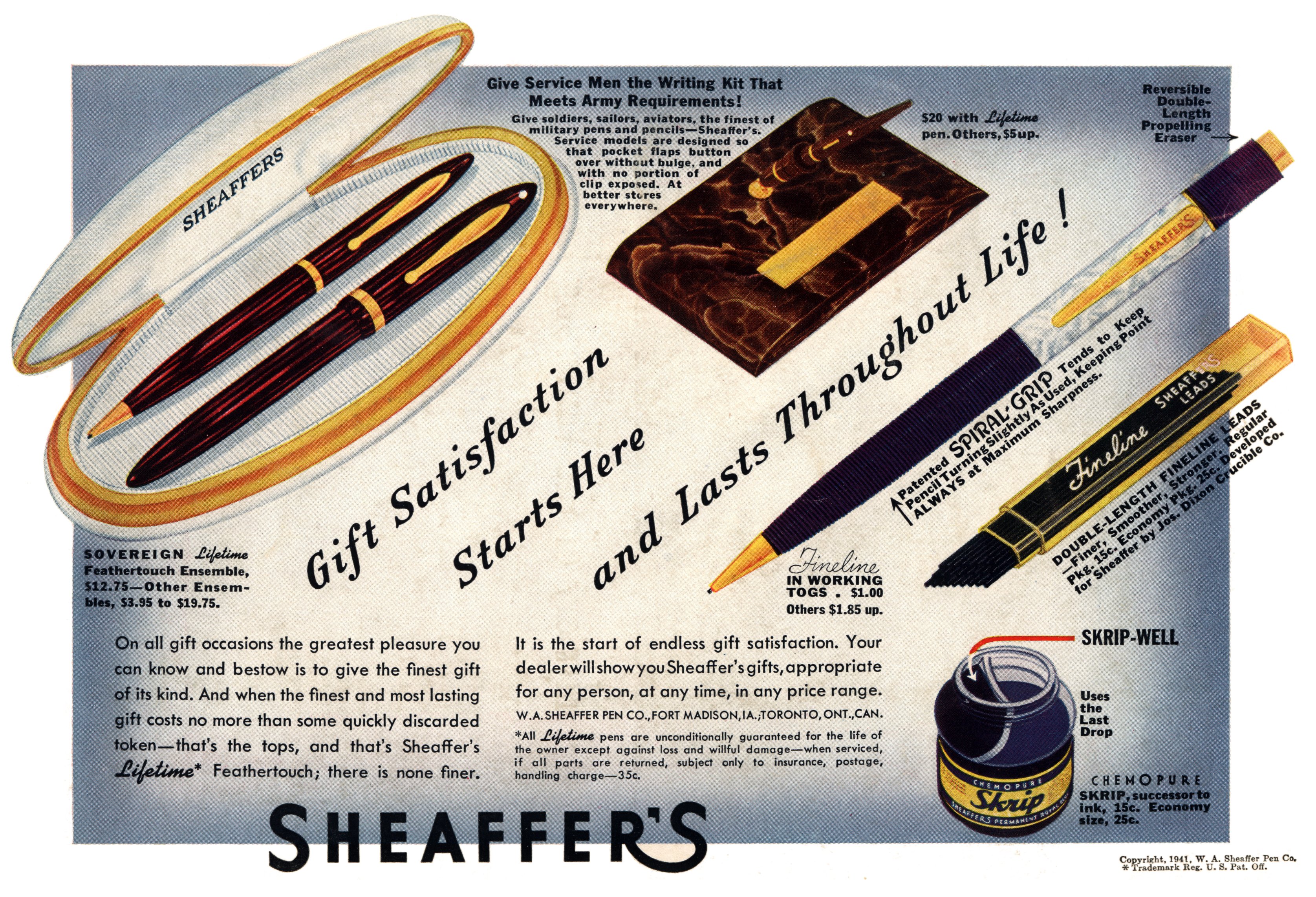 Scansione di una pubblicità Sheaffer datata 1941. Ritoccata dall'autore per una migliore nitidezza. Data visibile direttamente. Data dalla nota di copyright. Pubblicizza una penna in stile Balance chiamata Lifetime Feathertouch dalla combinazione delle due caratteristiche della garanzia a vita Lifetime e del pennino Feathertouch. Pubblicizza inoltre le meccaniche Fineline e menziona la boccetta Skrip-Well e l'inchiostro Chem-o-pure. Contributo di Armando Dabbene (utente forum fountainpen.it A Dabbene).