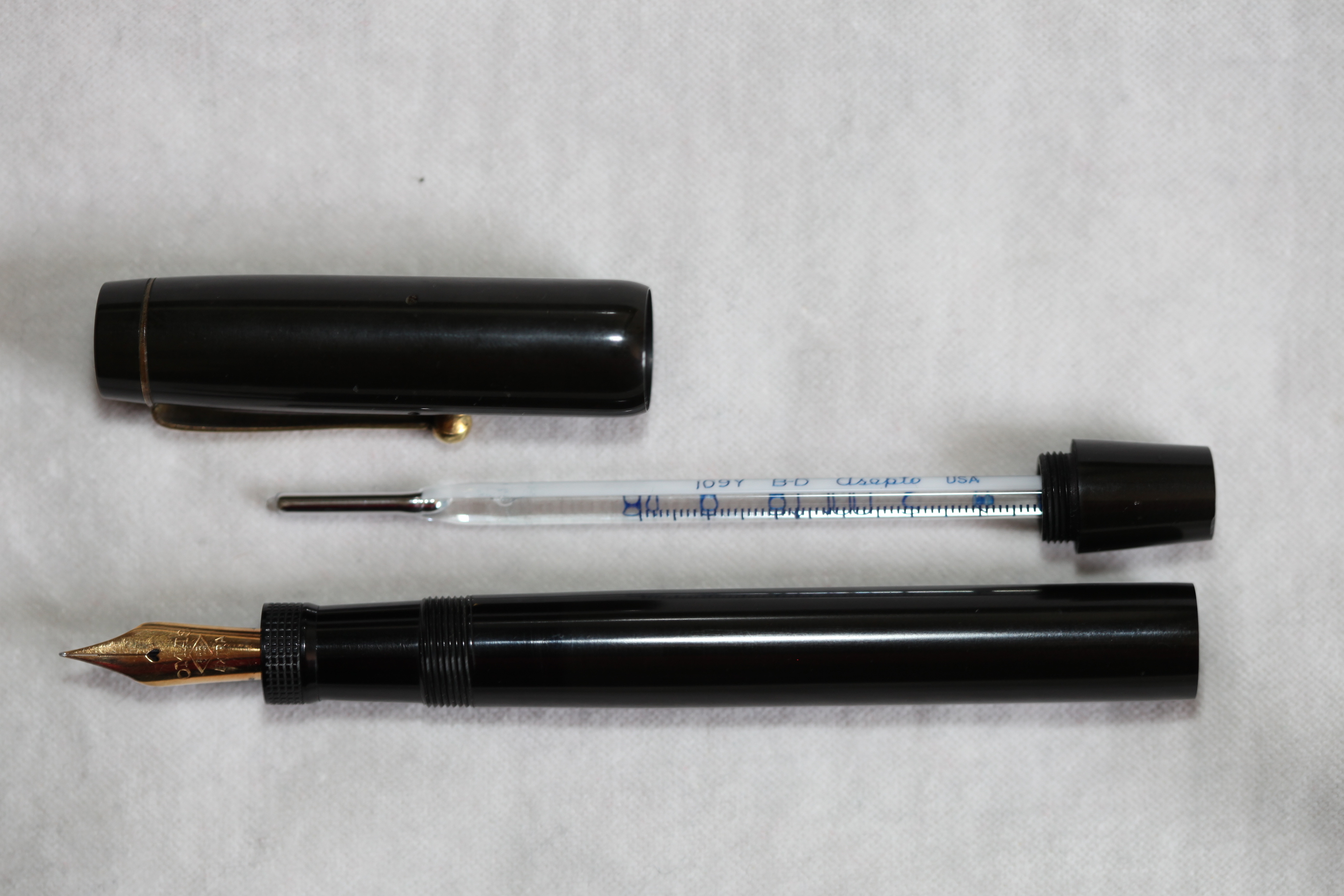 Photo of a rare Omas model called "Penna del dottore" (doctor pen), second version, equipped with a compartment for the thermometer inside the barrel.