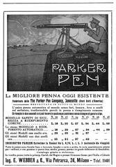 Scansione di una pubblicità Parker datata 1915. Ritoccata dall'autore per una migliore nitidezza. Data visibile direttamente. Data da un riferimento sul retro del foglio, in un articolo sul varo dell'esploratore Carlo Mirabello avvenuto quell'anno (fonte wikipedia). Pubblicizza le penne della Parker. Contributo di Armando Dabbene (utente forum fountainpen.it A Dabbene).