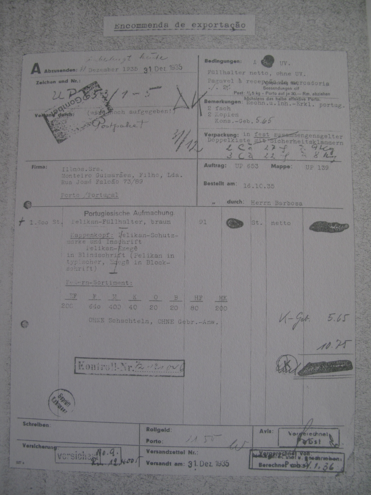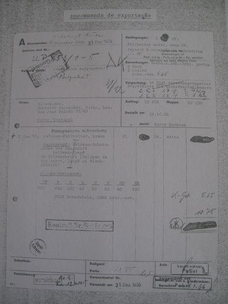 Scansione di un ordinativo Pelikan datata 16 ottobre 1935. Data visibile direttamente. Ordine originale da parte di Monteiro Guimarães, concessionario Pelikan per i paesi in lingua spagnola e portughese, relativo a 1600 Magnum marchiate Emegê sul cappuccio. Contributo di Vasco Pisco, (utente User:piscov).