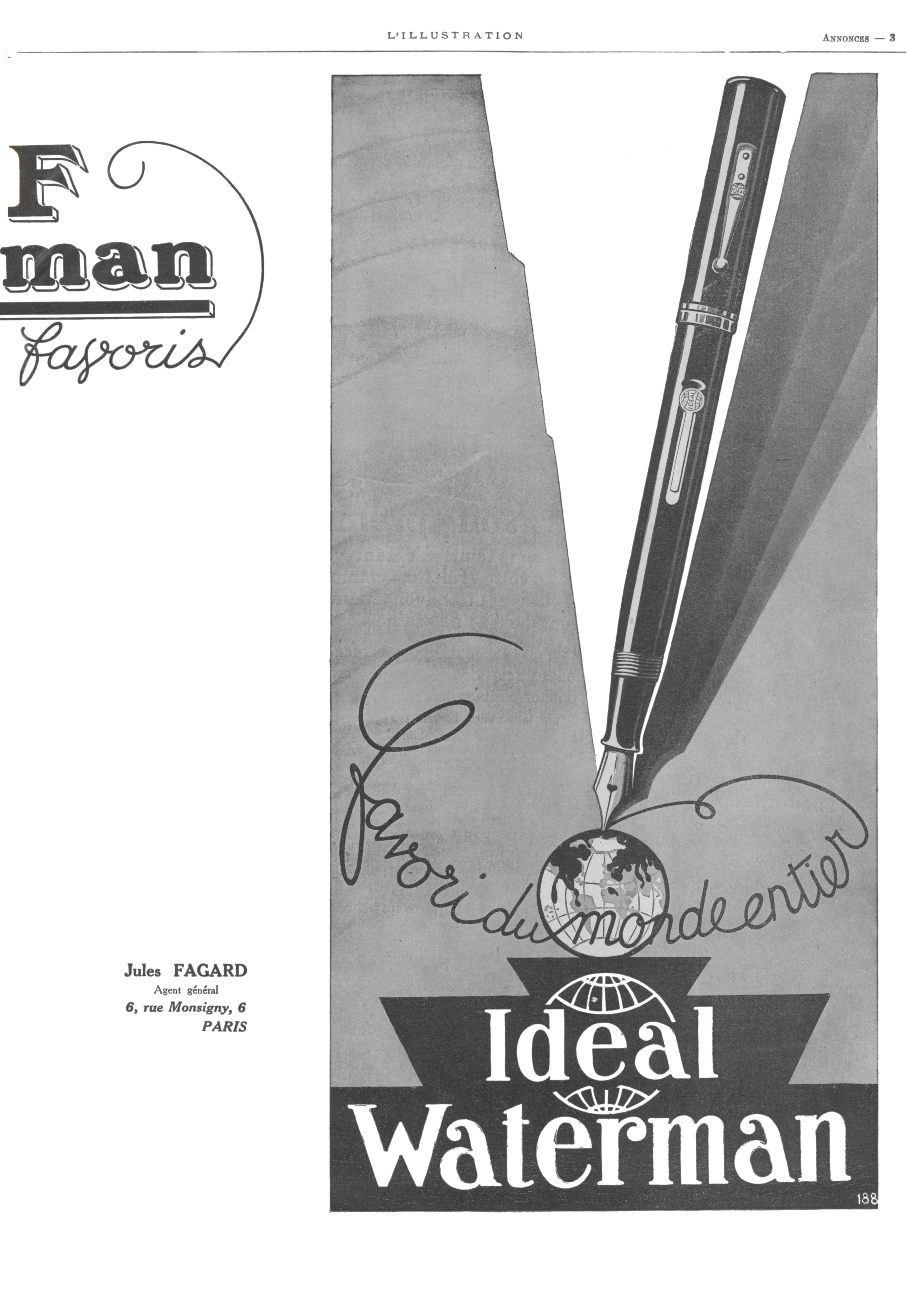 Scansione di una pubblicità Waterman datata 1926-05-08. Pubblicazione su: L'Illustration. Ritoccata dall'autore per una migliore nitidezza. Data visibile direttamente. Data riportata sul retro del foglio. Pubblicizza una Waterman 5x abbinata ad una matita meccanica JiF. Pagina destra. Contributo di Armando Dabbene (utente forum fountainpen.it A Dabbene).