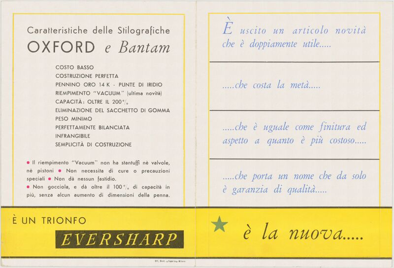 Scansione di un libretto Eversharp datata 1934. Data visibile direttamente. Data riportata sul retro del foglio. Presenta alcune penne della sottomarca Oxford e di alcune Bantham. Interno. Sull'altro lato di File:1934-Oxford-Bantham-Booklet-Ext.jpg.