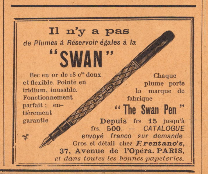 Scansione di una pubblicità Swan datata 1905-01-14. Pubblicazione su: L'Illustration. Ritoccata dall'autore per una migliore nitidezza. Data visibile direttamente. Anno 63, N. 3229. Data dal reperimento della pagina su una versione archiviata della rivista. Pubblicizza un modello con alimentatore overfeed denominato genericamente Swan Pen.