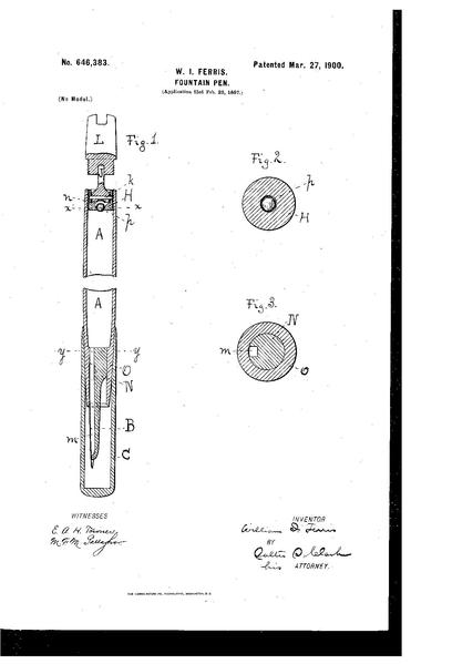 Brevetto per il caricamento denominato pump filler usato dalla Waterman. Riferimenti a n° US-578054.