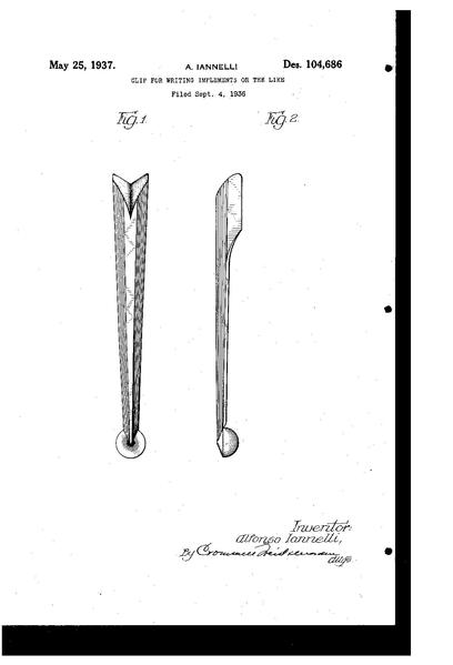 | attuale | 23:26, 22 ago 2012 | 1 159 × 1 704, 2 pagine (30 KB) | Piccardi (discussione | contributi) | {{PatentInfo |Inventor=Alfonso Iannelli |Assignee=The Wahl Company |Country=US |ApplicationNum=64718 |ApplicationDate=1936-09-04 |PatentNum=D104686 |PatentDate=1937-05-25 |PriorityDate=1936-09-04 |Titolo=Design for a clip for writing implement or the l... |