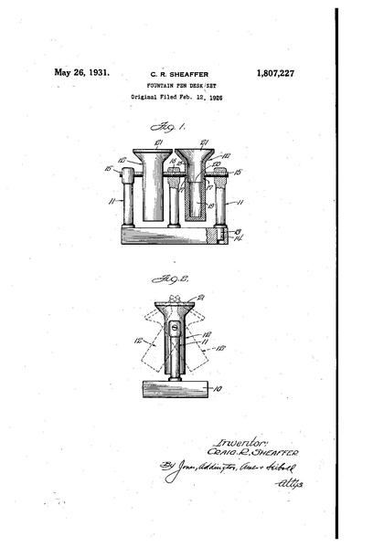 attuale22:06, 25 ott 2013Miniatura della versione delle 22:06, 25 ott 20131 159 × 1 704, 3 pagine (130 KB)Piccardi (discussione | contributi){{PatentInfo |Inventor=Craig R. Sheaffer |Assignee=Pen Desk Set Company |Country=US |ApplicationNum=87732 |ApplicationDate=1926-02-12 |PatentNum=1807227 |PatentDate=1931-05-26 |PriorityDate=1926-02-12 |Titolo=Fountain-pen desk stand |Marca=Pen Desk Set...