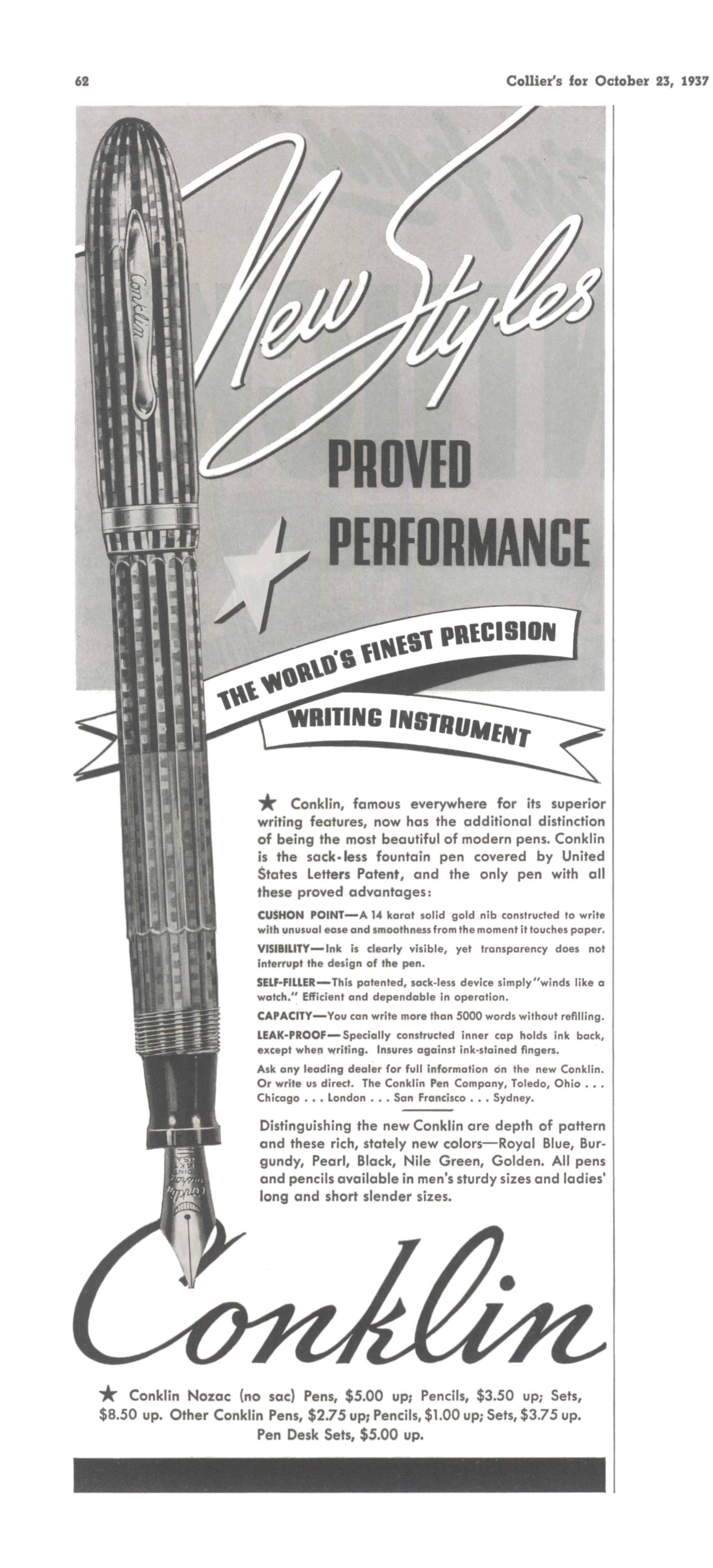 Scansione di una pubblicità Conklin datata 1937-10-23. Pubblicazione su: Collier's. Ritoccata dall'autore per una migliore nitidezza. Data visibile direttamente. Data riportata sul retro del foglio. Pubblicizza il modello Nozac .