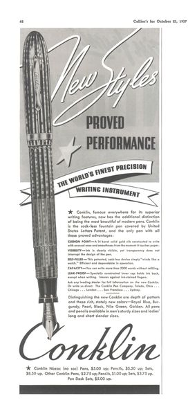 Scanning of advertising from Conklin dated 1937-10-23. Published on: Collier's. Retouched by the author for a better sharpness. Date directly visible. Data riportata sul retro del foglio. Advertising for the Nozac model.