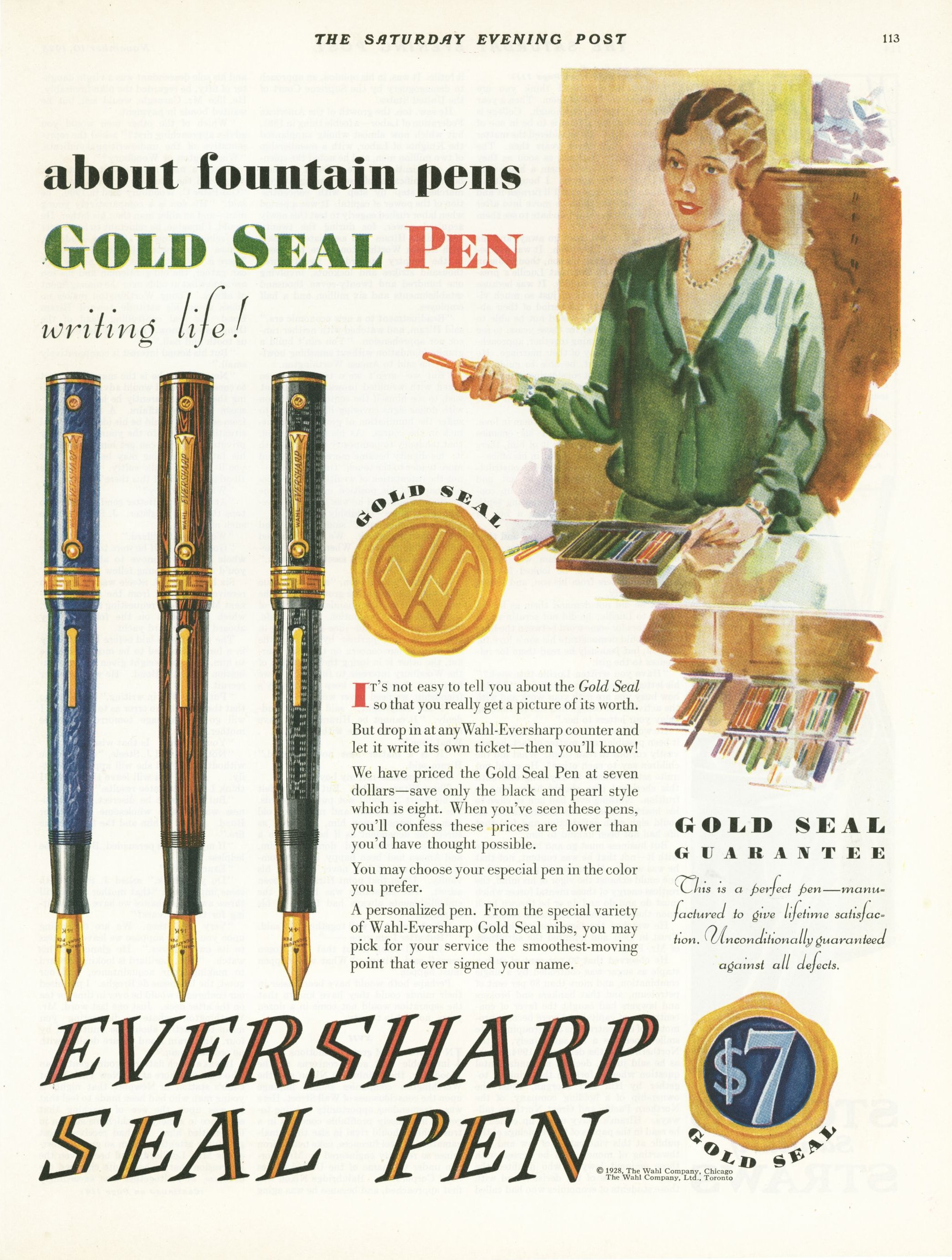 Scansione della seconda pagina di una pubblicità della serie Deco band della Eversharp, pubblicata nel Novembre 1928 sul The Saturday Evening Post.