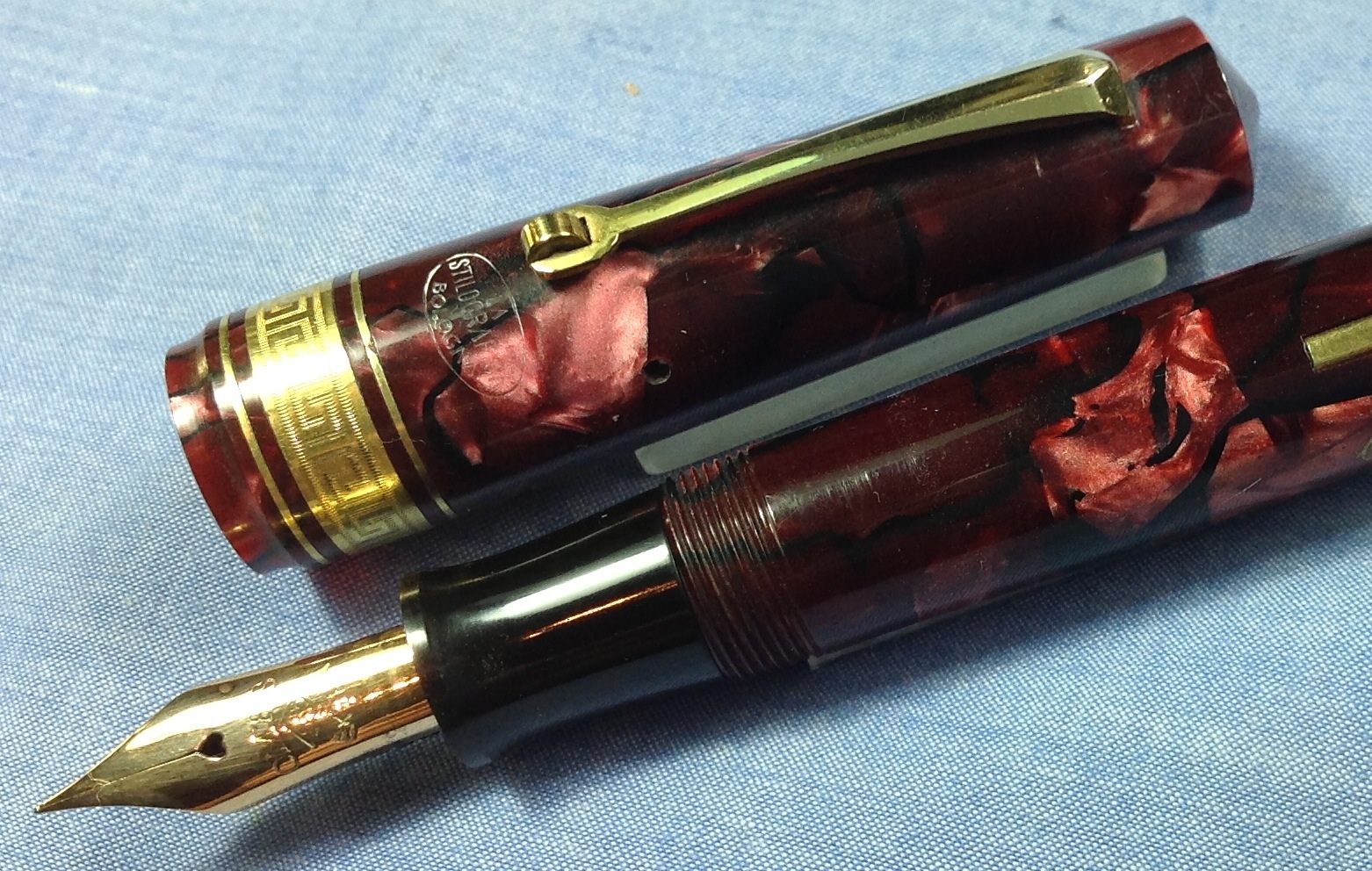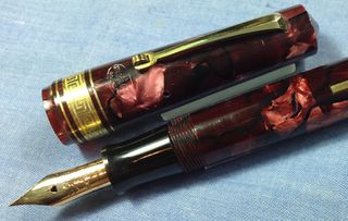 Photo of a Omas Lucens marbled red marked La Stilografica Bologna, produced for the the Germano brand, owner of the shop and also known for the For Ever brand. Detail of inscription.