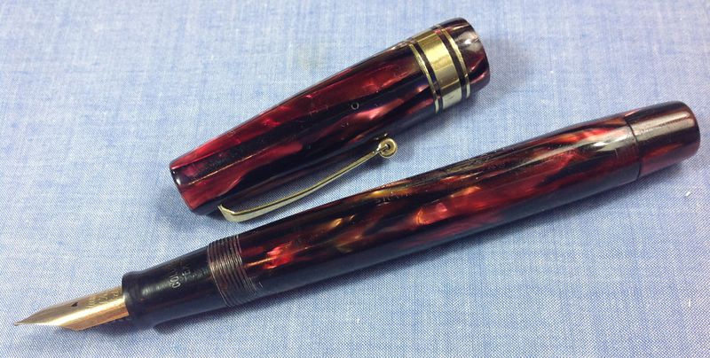 Photo of a Columbus Extra 98 model with roll clip red striated celluloid.