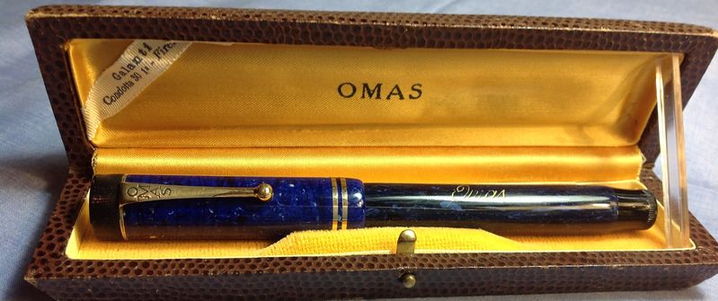 Photo of an rare early Omas flat-top, in Duofold style in lapis blues celluloid.