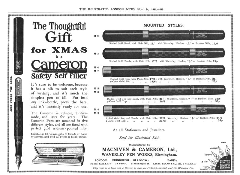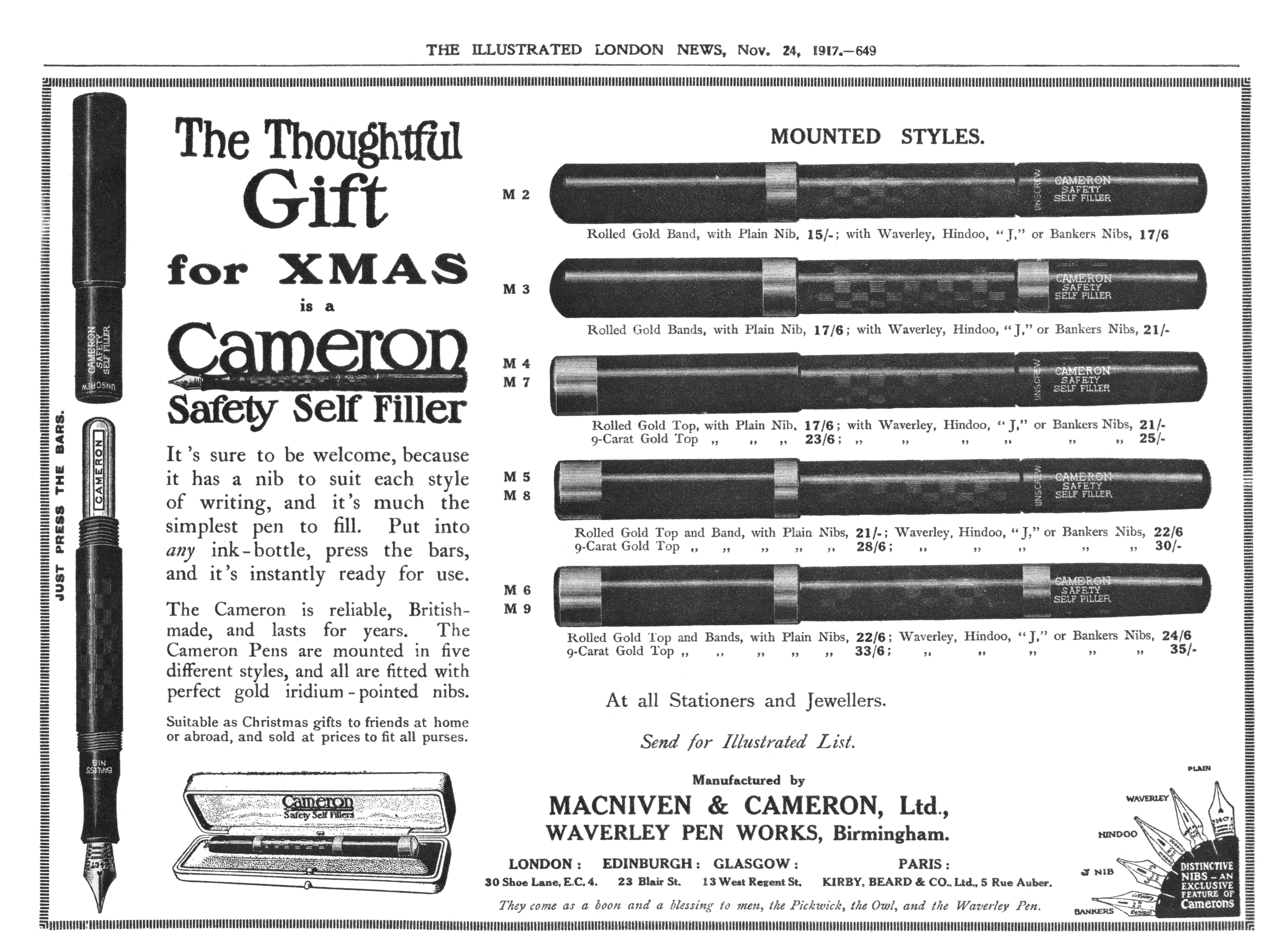Scanning of advertising from Cameron dated 1917-11-24. Published on: The Illustrated London News. Retouched by the author for a better sharpness. Date directly visible. Advertising for the Cameron Safety Self Filler model.