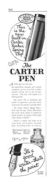 Scansione di una pubblicità Carter datata 1924-04. Pubblicazione su: The American Magazine. Ritoccata dall'autore per una migliore nitidezza. Data visibile direttamente. Data indicata dal fornitore, affidabile. Pubblicizza le nuove penne della Carter, denominate semplicemente The Carter Pen.
