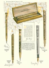 Scanning of advertising from Eversharp dated 1925-12-12. Published on: The Literary Digest. Retouched by the author for a better sharpness. Date directly visible. Advertising for a series of Wahl Engine Turned pens in differente patterns (Diamond, Wave and Dart) and Eversharp pencils. Left page.