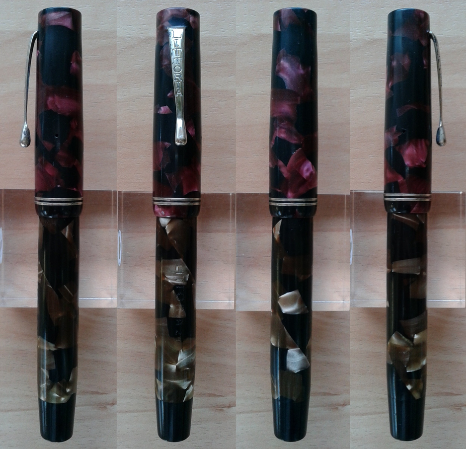 Foto di una Littoria n. 24 in celluloide marmorizzata, probabilmente ricomposta con cappuccio porpora e corpo marrone. Contributo di Giorgio (utente forum Musicus).