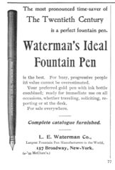 Scansione di una pubblicità Waterman datata 1899. Pubblicazione su: McClure's Magazine. Ritoccata dall'autore per una migliore nitidezza. Data visibile direttamente. Data indicata dal fornitore, affidabile. Confermata dal riferimento a "(4-'99 McClure's)". Pubblicizza una Waterman Ideal Fountain Pen. Stesso foglio di File:1899-AW-Faber-Pencil.jpg, File:1899-Carter-Ink.jpg, File:1899-Staffords-Ink-2.jpg, File:1899-Esterbrook-Nib.jpg, File:1899-Gillot-Nibs.jpg.