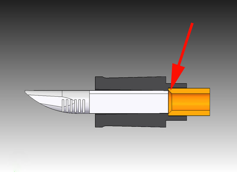 Schema della smussatura operata sul tubetto di riparazione di una sezione per consentire il passaggio di inchiostro verso il canale dell'alimentatore.
