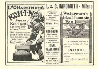 Scansione di una pubblicità Waterman datata 1908-04. Pubblicazione su: La Lettura. Ritoccata dall'autore per una migliore nitidezza. Data visibile direttamente. Rivista Mensile del Corriere della Sera - Anno VIII - N.4. Data indicata dal fornitore, affidabile. Pubblicità generica della ditta con modelli ignoti, appaiata alla pubblicità della matite Koh-i-Noor da parte della Hardtmuth allora concessionaria. Contributo di Giorgio (utente forum Musicus).