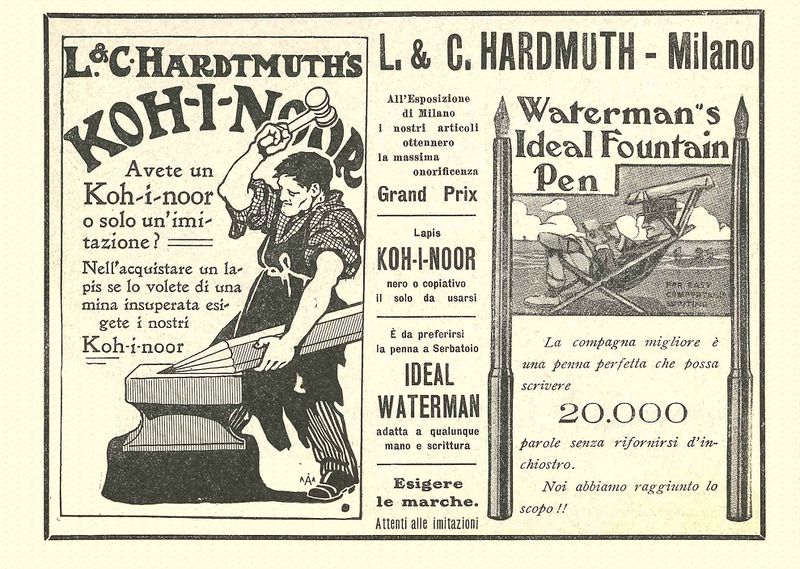 Scanning of advertising from Waterman dated 1908-04. Published on: La Lettura. Retouched by the author for a better sharpness. Date directly visible. Rivista Mensile del Corriere della Sera, Year VIII - N.4. Dating given by provider, reliable. Generic advertising of the company with some unknown models, paired to Koh-i-Noor pencil advertising by Hardtmuth, then reseller for both.