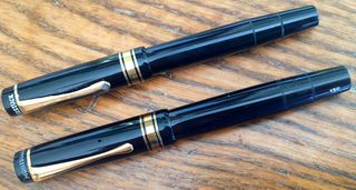 Photo of two Montblanc transitional models, Montblanc 136 and Montblanc 134, with different clips, short cap head and flat band version.