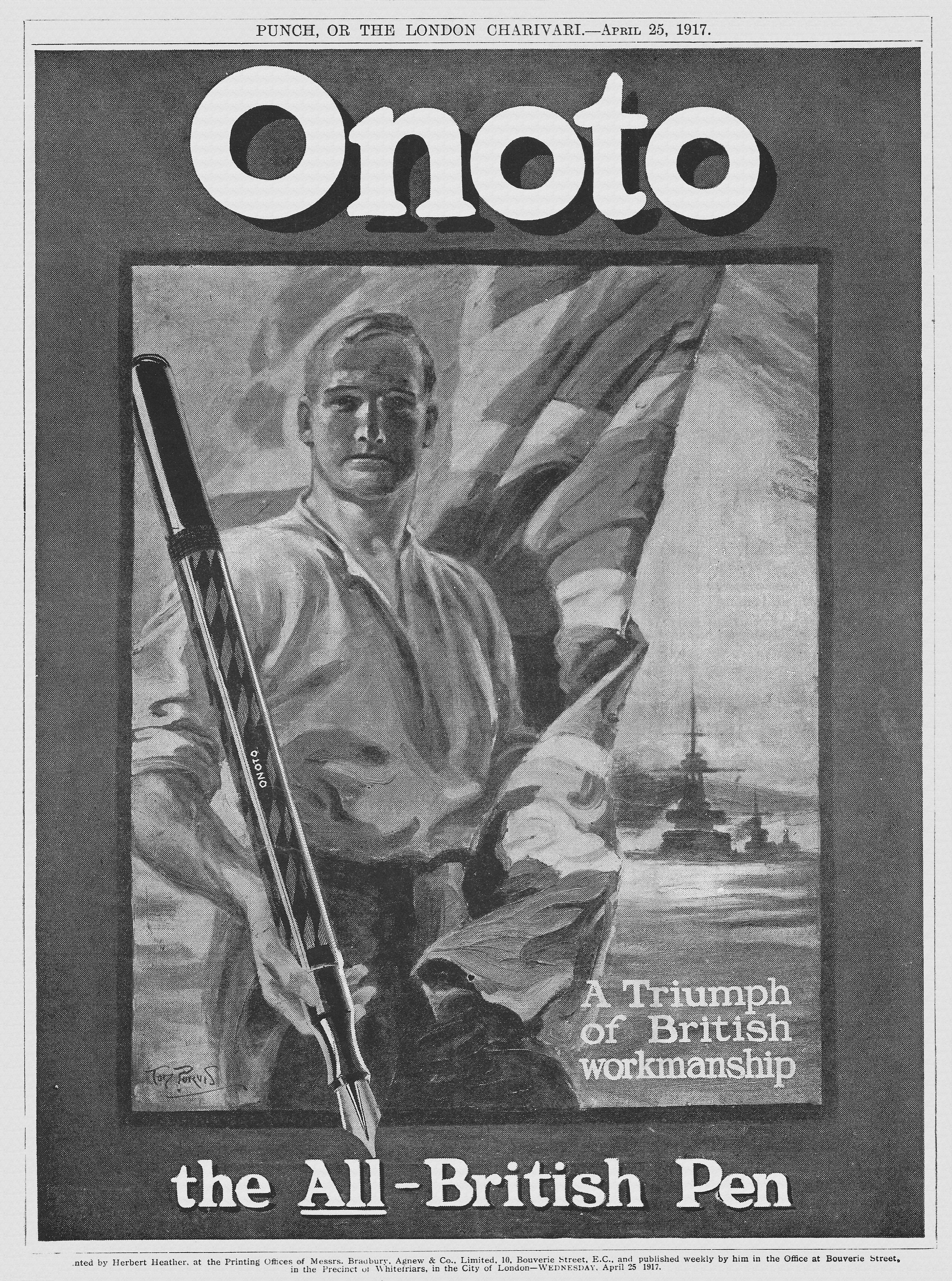 Scansione di una pubblicità Onoto datata 1917-04-25. Pubblicazione su: Punch, or the London Charivari. Ritoccata dall'autore per una migliore nitidezza. Data visibile direttamente. Pubblicizza delle penne della serie 3000.