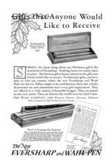 Scansione di una pubblicità Eversharp datata 1925. Pubblicazione su: The National Geographic Magazine. Ritoccata dall'autore per una migliore nitidezza. Data visibile direttamente. Data dalla nota di copyright. Pubblicizza un set penna/matita Wahl Engine Turned, nella lavorazione Colonial ed uno stiloforo.