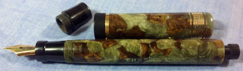 Foto di una The King (altro nome della SAFIS), modello Diamond, stile Duofold in celluloide verde e bronzo, con il particolare caricamento a rotazione. Contributo di Massimo, utente forum Maxpen2012.