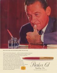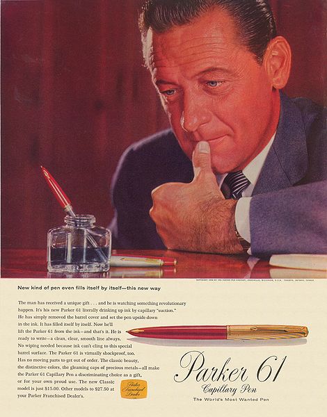 Scansione di una pubblicità Parker datata 1958-04-05. Pubblicazione su: The Saturday Evening Post. Ritoccata dall'autore per una migliore nitidezza. Data indicata dal fornitore, affidabile. Pubblicizza il modello Parker 61.