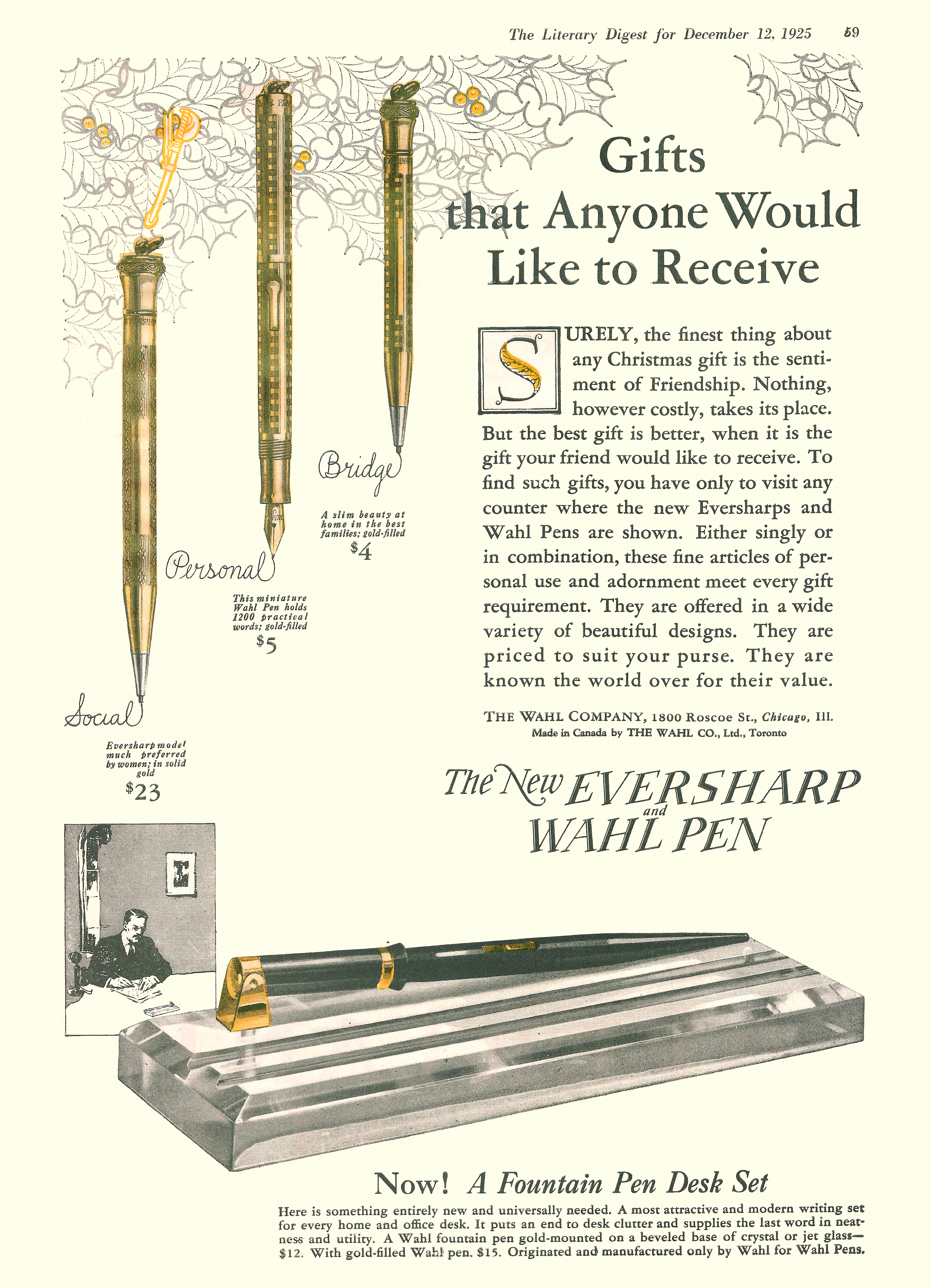 <multilang> @it|Scansione di una pubblicità Eversharp del Dicembre 1925 per una serie di penne e matite meccaniche Wahl Engine Turned. Pubblicata sul The Literary Digest. Ritoccata dall'autore per una migliore nitidezza. Pagina destra. @en|Scanning of a December 1925 Eversharp advertising for a series of Wahl Engine Turned pens and pencils. Published on The Literary Digest. Retouched by the author for a better sharpness. Right page. </multilang>