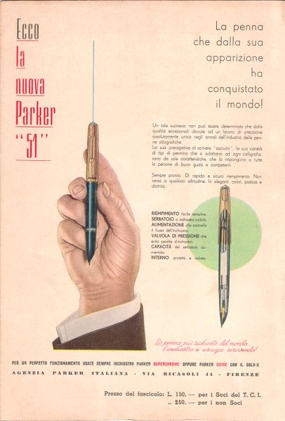 Scanning of advertising from Parker dated 1948. Published on: Le vie d'Italia - Rivista mensile del Touring Club Italiano. Retouched by the author for a better sharpness. Guess date, Guess date, stands for '40s second half, at least from 1947 (Superchrome Ink started to appears that year). Advertising for the Parker 51 model, citing the Superchrome Ink.