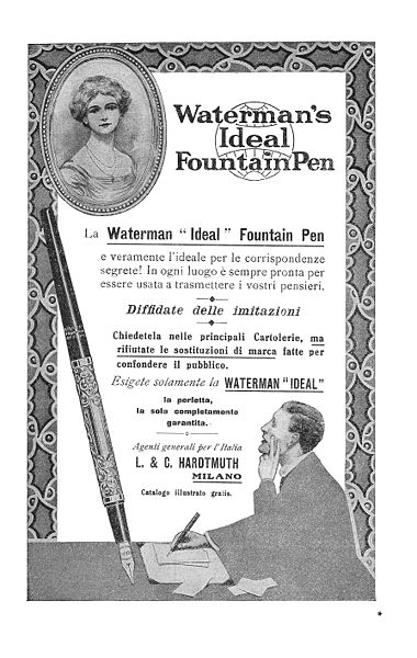 Scansione di una pubblicità Waterman datata 1913. Ritoccata dall'autore per una migliore nitidezza. Data indicativa, ma antecendente al 1914, anno in cui Drisaldi assunse la rappresentanza della Waterman. Pubblicizza una 2x con cappuccio conico (tapered cap).