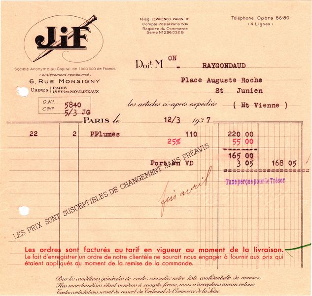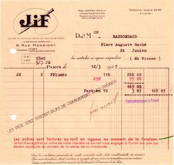 Scanning of a bill from JiF dated 1937-03-12. Date directly visible. Refers to unidentified fountain pens. Retouched by the author for a better sharpness.