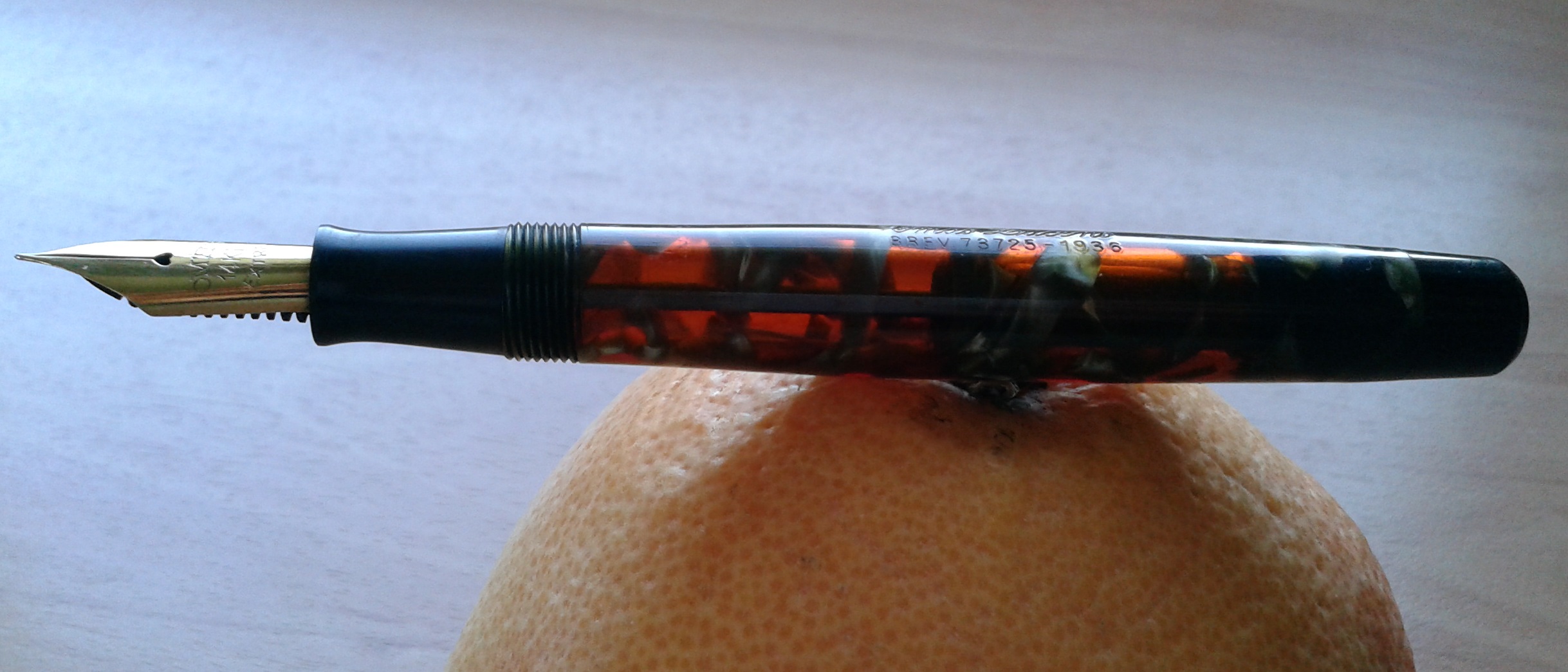 Foto di un Omas Lucens in celluloide marmorizzata verde, dimensione media. Contributo di Giorgio (utente forum Musicus).