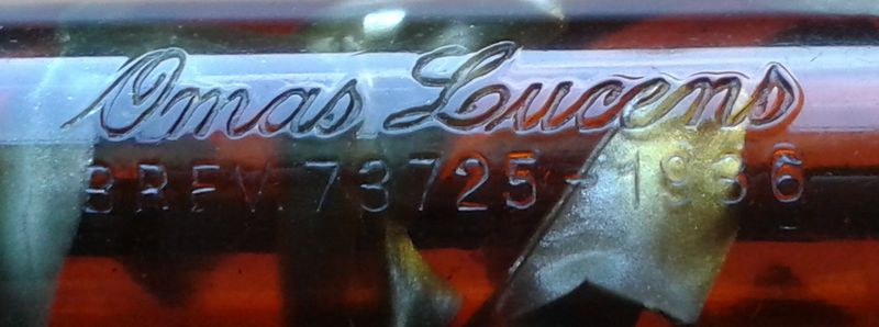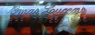 Foto di una Omas Lucens in celluloide marmorizzata verde, dimensione media. Detail of inscription. Contributo di Giorgio (utente forum Musicus).